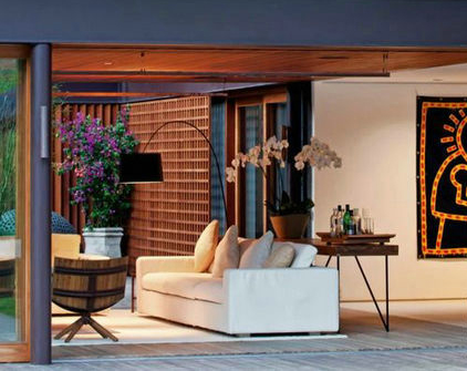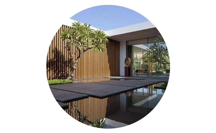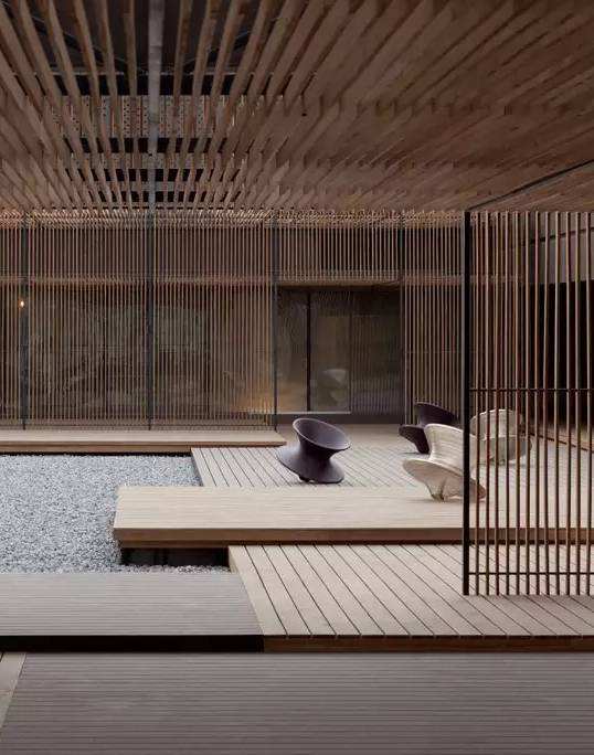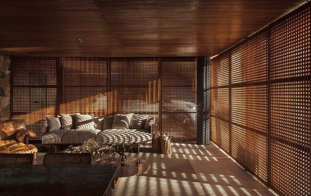 格栅充满不一般的艺术张力,具有浓厚的禅意。设计师喜欢把格栅融入到建筑的每一个细节中,同时善于与自然融合,比如很多朴实的材料:木材、混凝土、夯土等,让人感受返璞中呈现出朴质的奢华。